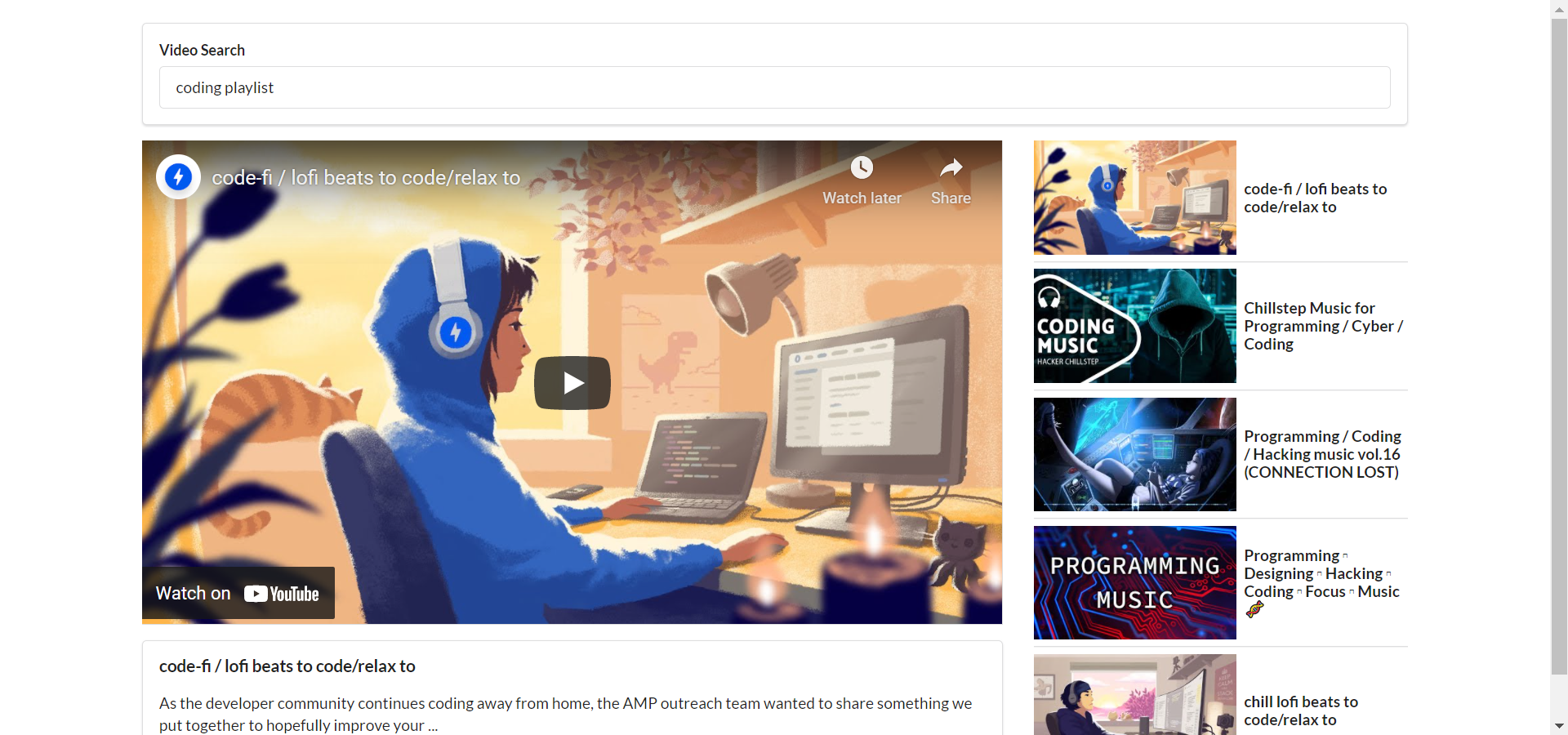 A simplistic YouTube Clone developed using React. It Uses YouTube API to fetch video from YouTube database and display it to VideoPlayer made with React components.